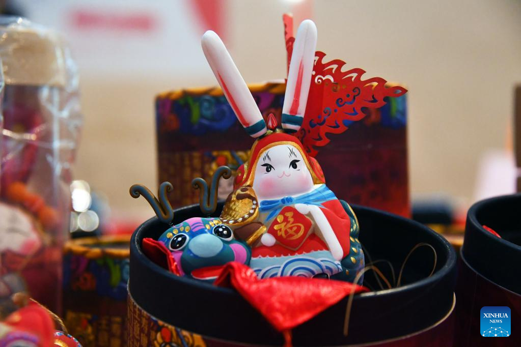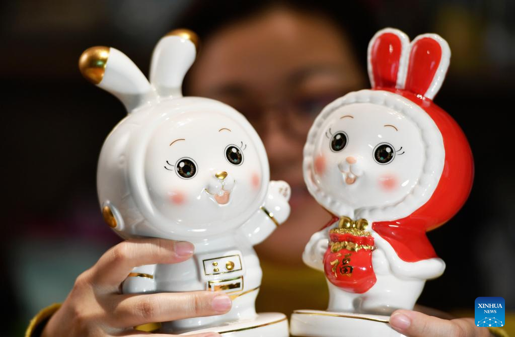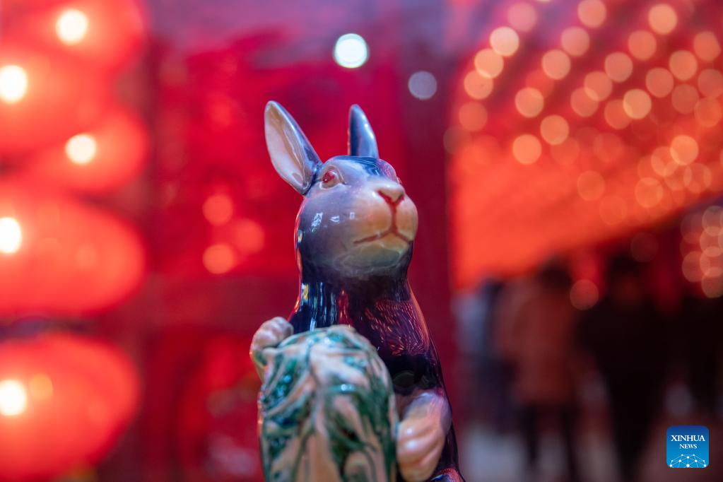 This photo taken on Jan. 22, 2023 shows a ceramic rabbit displayed during an exhibition in Harbin, northeast China's Heilongjiang Province.