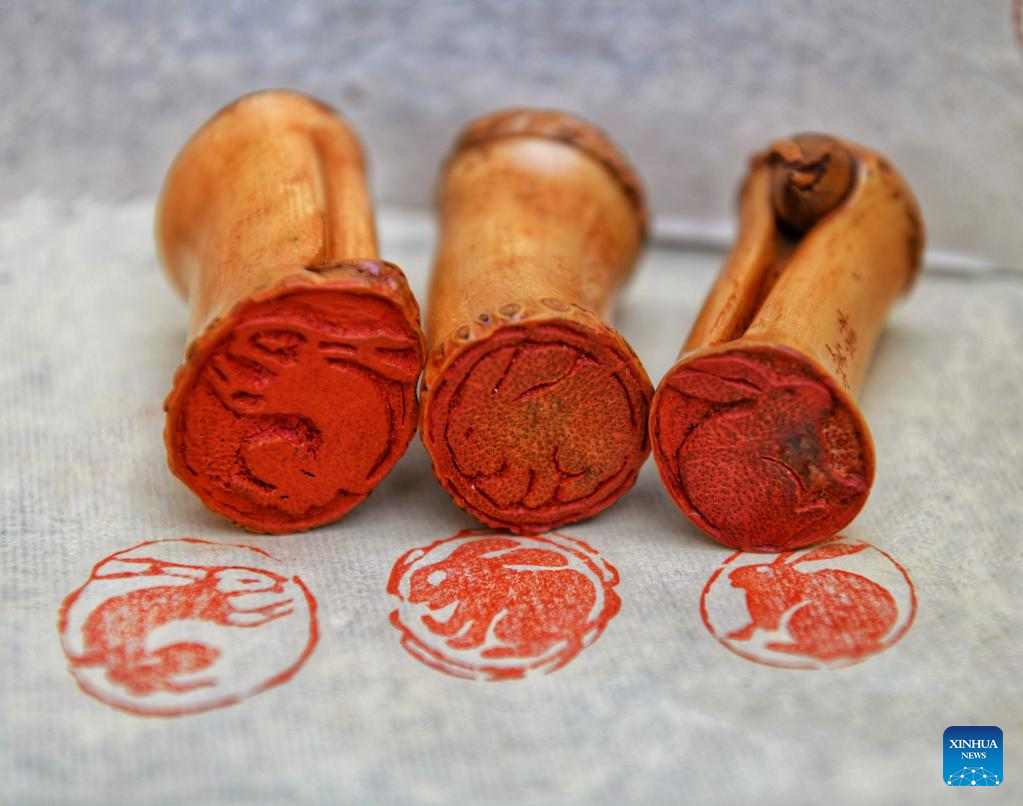 This photo taken on Jan. 19, 2023 shows rabbit-themed seals carved with bamboo roots by Zhang Donghua, inheritor of Wuyi bamboo carving, in Wuyishan City, southeast China's Fujian Province. The Chinese New Year for 2023 marks the Year of the Rabbit -- a gentle and beloved animal that signifies vitality, wittiness, cautiousness and good luck in the Chinese zodiac. (Photo by Chen Ying/Xinhua)