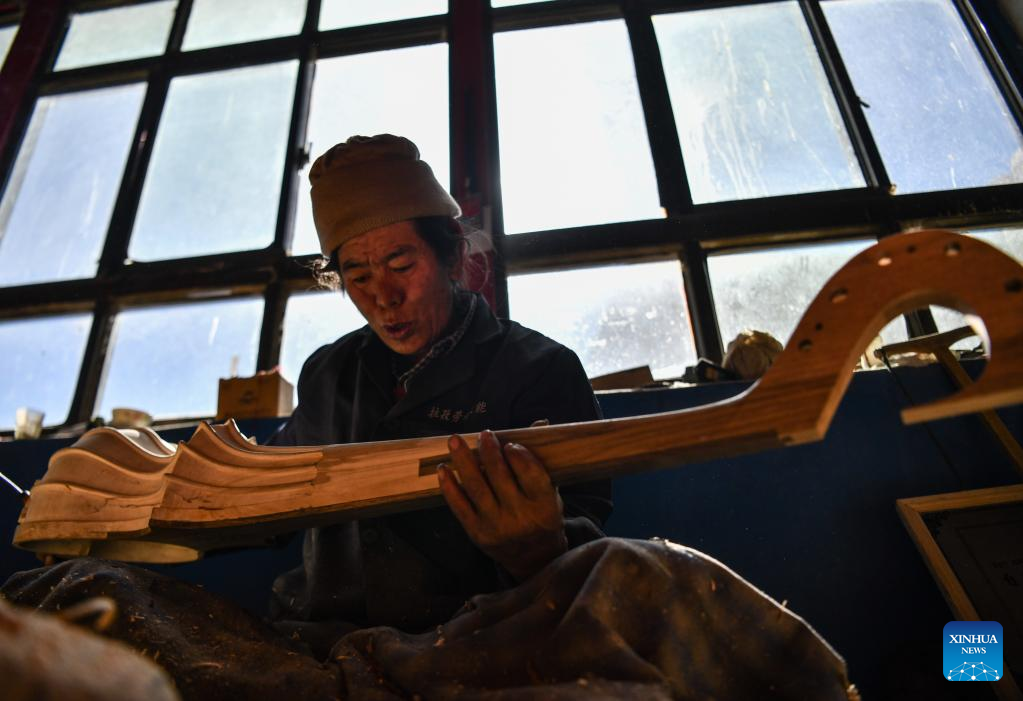 A craftsman makes a Zhanian instrument in Lnaze County, southwest China's Tibet Autonomous Region, Jan. 19, 2023.