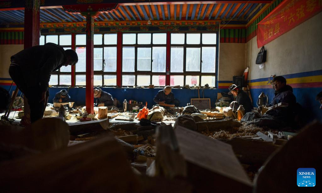 Craftsmen make Zhanian instruments in Lnaze County, southwest China's Tibet Autonomous Region, Jan. 19, 2023.