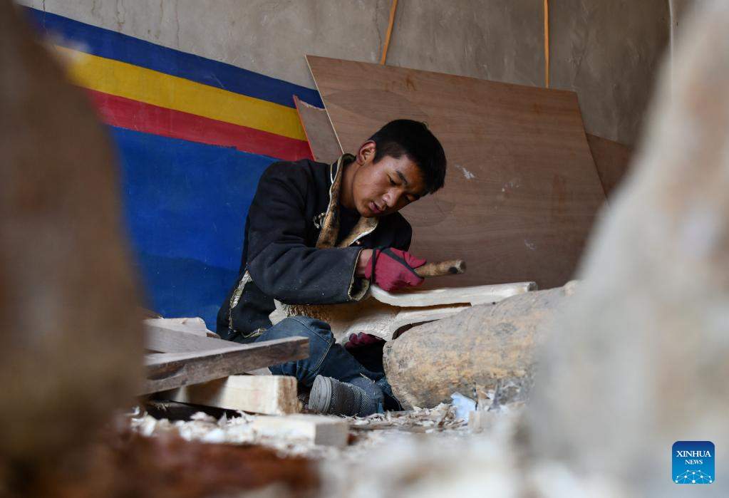 The younger son of Sonam Chungla makes a Zhanian instrument in Lnaze County, southwest China's Tibet Autonomous Region, Jan. 19, 2023.