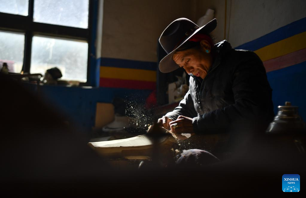 Sonam Chungla makes a Zhanian instrument in Lnaze County, southwest China's Tibet Autonomous Region, Jan. 19, 2023.