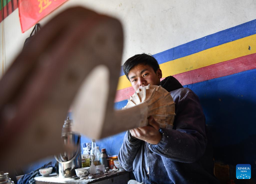 The elder son of Sonam Chungla makes a Zhanian instrument in Lnaze County, southwest China's Tibet Autonomous Region, Jan. 19, 2023.