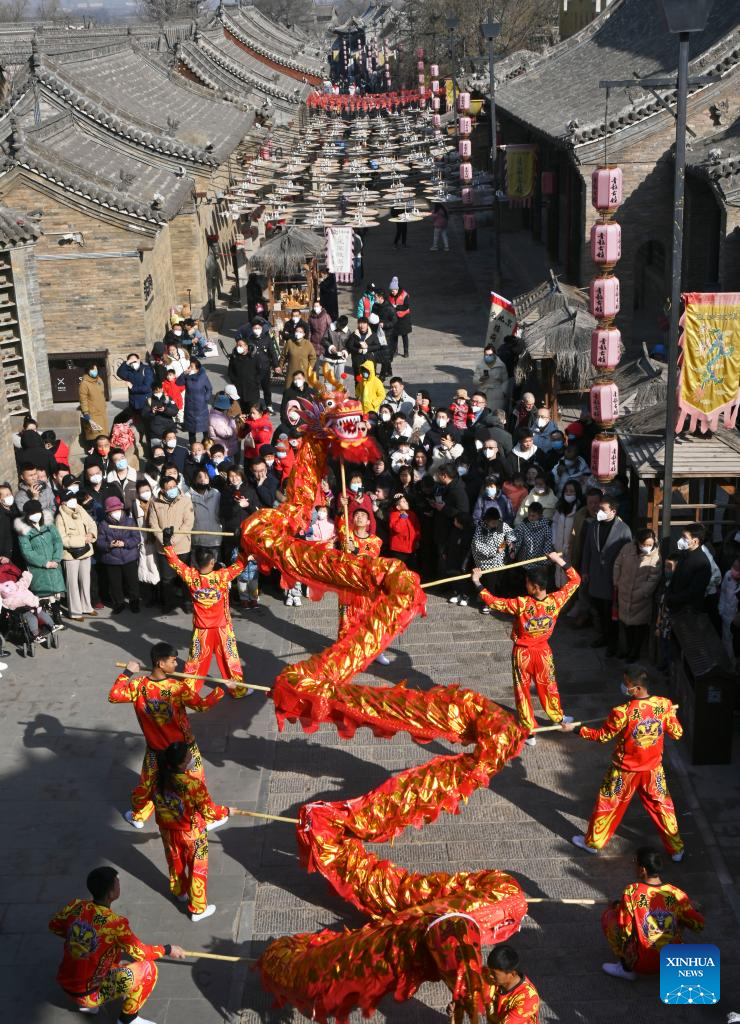 Tourists watch a dragon dance performance at the ancient town of Qinglong in Yangqu County, north China's Shanxi Province, Jan. 22, 2023. The Chinese Lunar New Year, or Spring Festival, falls on Sunday. (Xinhua/Ma Yimin)