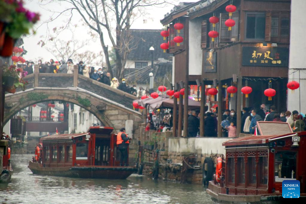 Tourists visit the Shantang ancient street in Suzhou, east China's Jiangsu Province, Jan. 22, 2023. The Chinese Lunar New Year, or Spring Festival, falls on Sunday. (Photo by Wang Jiankang/Xinhua)