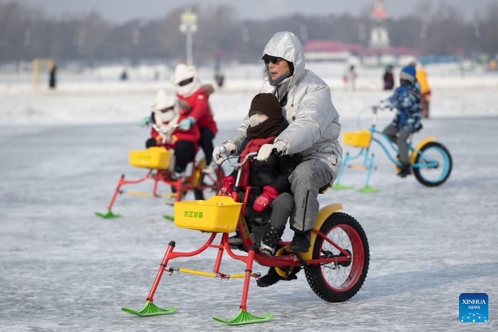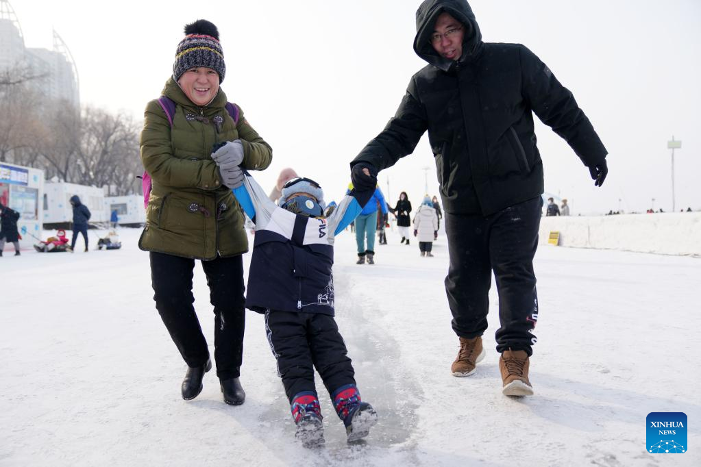 People have fun at the Ice and Snow Carnival Park on the Songhua River in Harbin, northeast China's Heilongjiang Province, Jan. 22, 2023. The Chinese Lunar New Year, or Spring Festival, falls on Sunday. (Xinhua/Wang Jianwei)