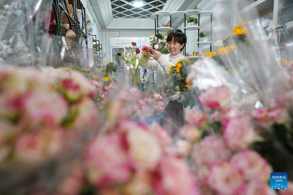 A woman arranges flowers at a handicraft shop in Xiangdu District of Xingtai, north China's Hebei Province, Jan. 22, 2023. The Chinese Lunar New Year, or Spring Festival, falls on Sunday. (Xinhua/Mu Yu)