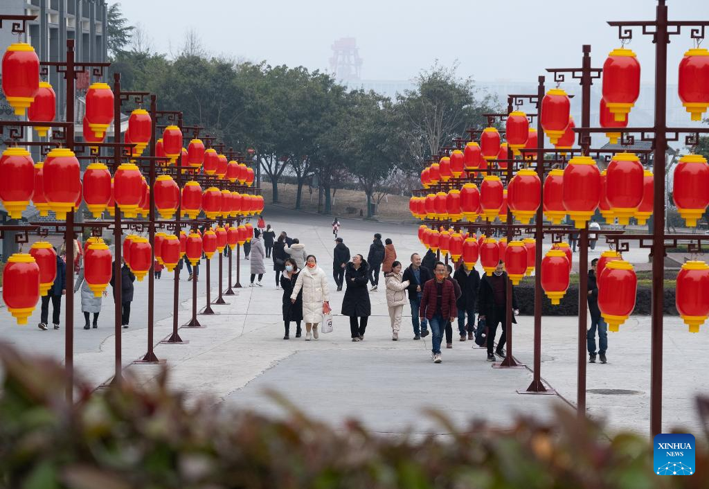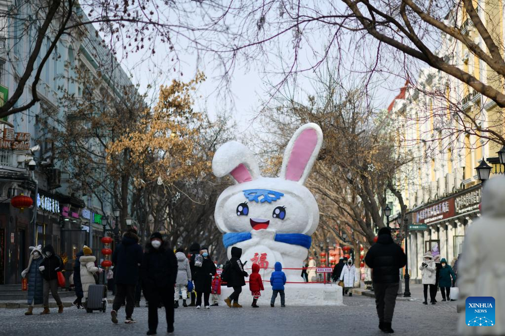 People have fun on the Central Street in Harbin, northeast China's Heilongjiang Province, Jan. 22, 2023. The Chinese Lunar New Year, or Spring Festival, falls on Sunday. (Xinhua/Wang Jianwei)