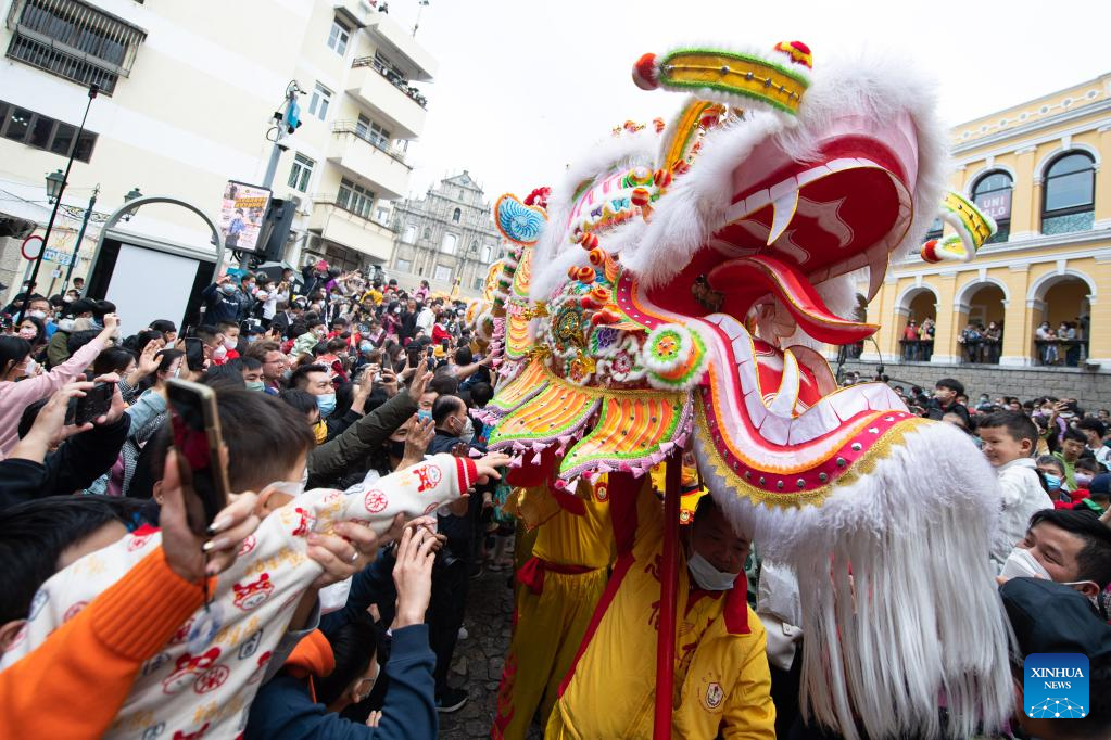 Actors perform dragon dance in front of the Ruins of St. Paul's in south China's Macao, Jan. 22, 2023. The Chinese Lunar New Year, or Spring Festival, falls on Sunday. (Xinhua/Cheong Kam Ka)