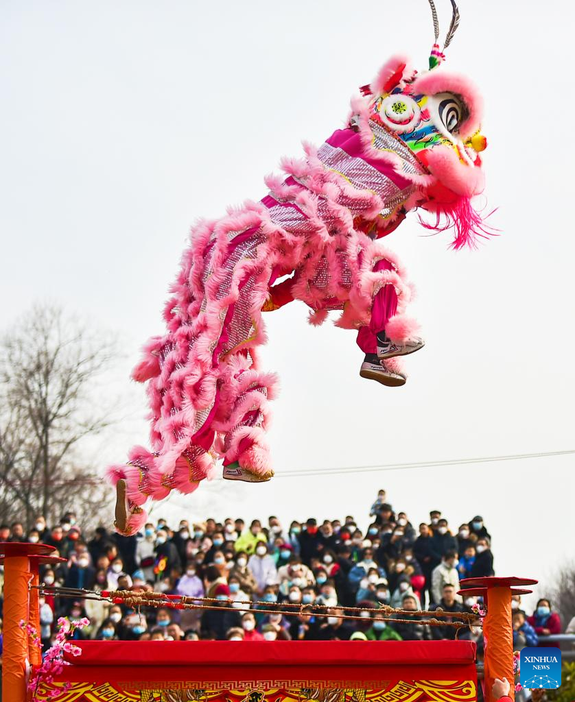 People watch a lion dance performance at a temple fair in Luoyang, central China's Henan Province, Jan. 22, 2023. The Chinese Lunar New Year, or Spring Festival, falls on Sunday. (Photo by Huang Zhengwei/Xinhua)