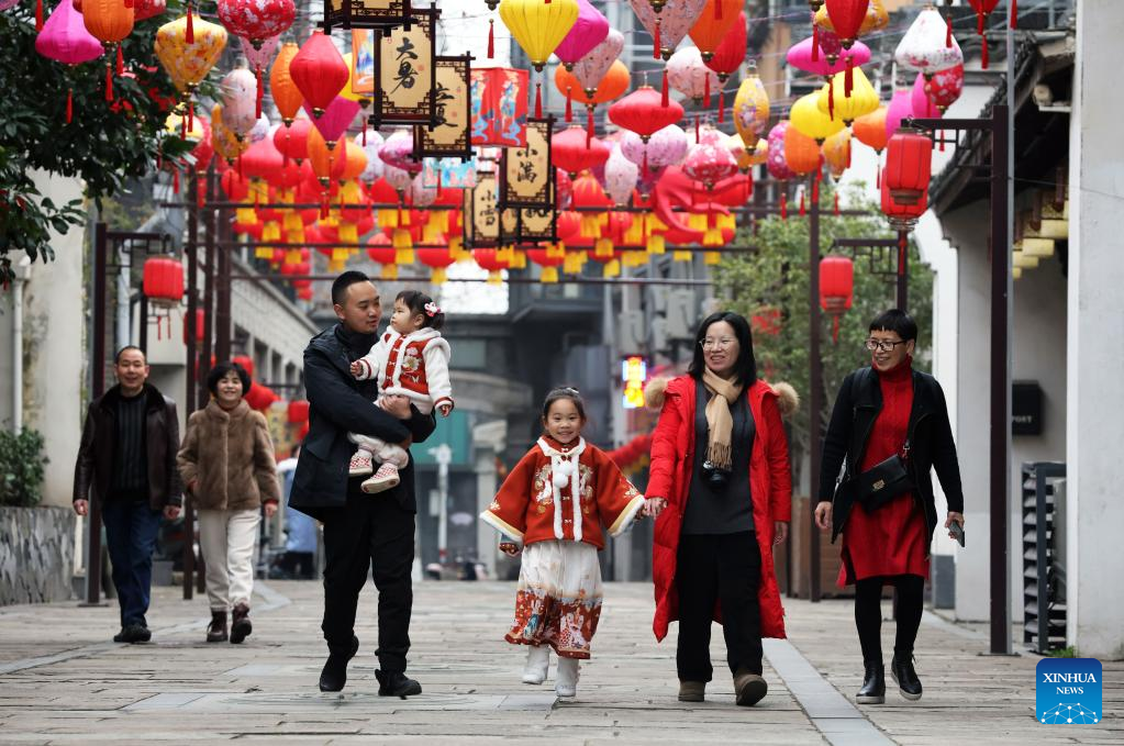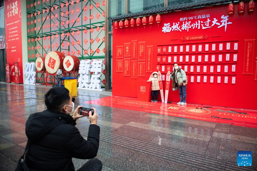 Residents pose for photos at a pedestrian street in Changsha, central China's Hunan Province, Jan. 22, 2023. The Chinese Lunar New Year, or Spring Festival, falls on Sunday. (Xinhua/Chen Sihan)