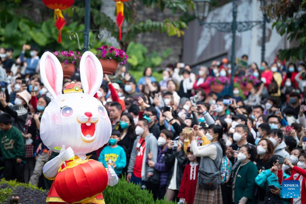 Tourists watch a performance at the Ruins of St. Paul's in south China's Macao, Jan. 22, 2023. The Chinese Lunar New Year, or Spring Festival, falls on Sunday. (Xinhua/Cheong Kam Ka)