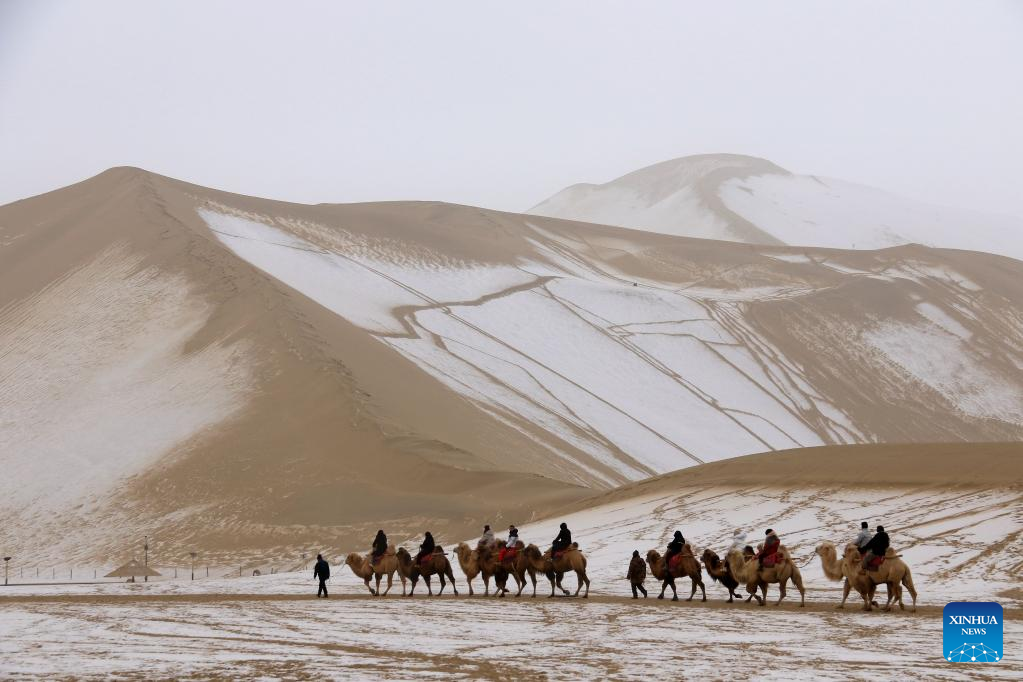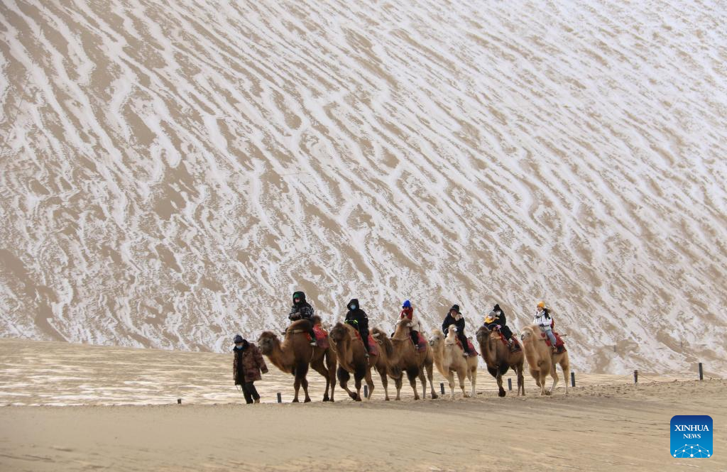 Tourists visit the Mingsha Mountain and Crescent Spring scenic spot in Dunhuang, northwest China's Gansu Province, Jan. 22, 2023. The Chinese Lunar New Year, or Spring Festival, falls on Sunday. (Photo by Zhang Xiaoliang/Xinhua)