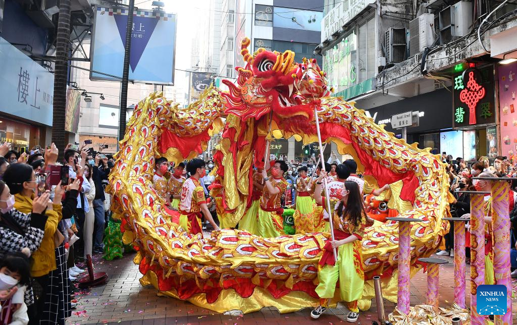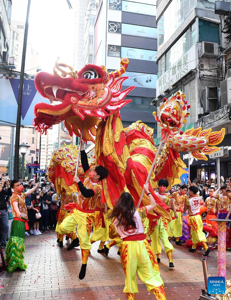 Artists perform dragon dance in Wan Chai, Hong Kong, south China, Jan. 22, 2023. The Chinese Lunar New Year, or Spring Festival, falls on Sunday. (Xinhua/Chen Duo)
