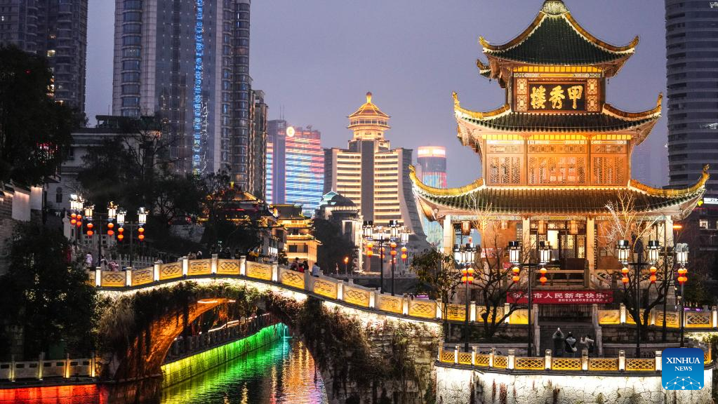 People visit the Jiaxiu Pavilion in Nanming District of Guiyang City, southwest China's Guizhou Province, Jan. 22, 2023. The Chinese Lunar New Year, or Spring Festival, falls on Sunday. (Xinhua/Tao Liang)
