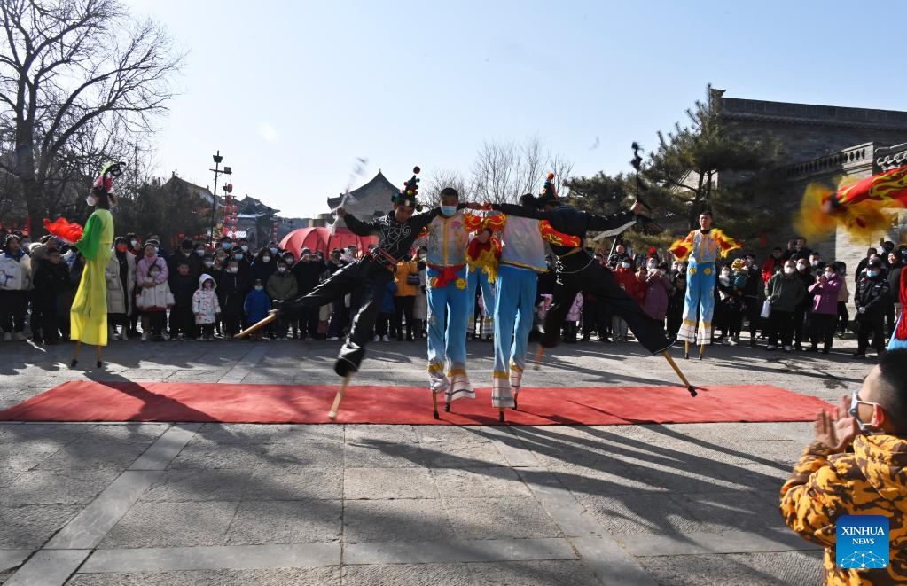 Folk artists perform on stilts at the ancient town of Qinglong in Yangqu County, north China's Shanxi Province, Jan. 22, 2023. The Chinese Lunar New Year, or Spring Festival, falls on Sunday. (Xinhua/Ma Yimin)