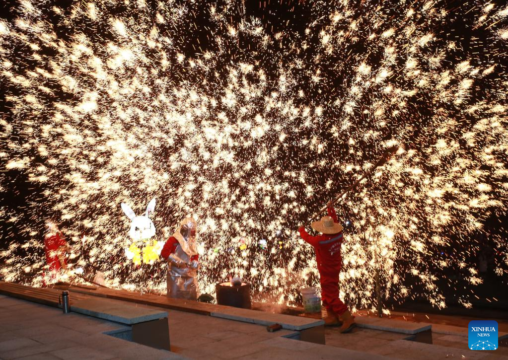 Performers stage a molten iron fireworks show in celebration of the Spring Festival in Xuyi County, east China's Jiangsu Province, Jan. 22, 2023. The Chinese Lunar New Year, or Spring Festival, falls on Sunday. (Photo by Yan Huaifeng/Xinhua)