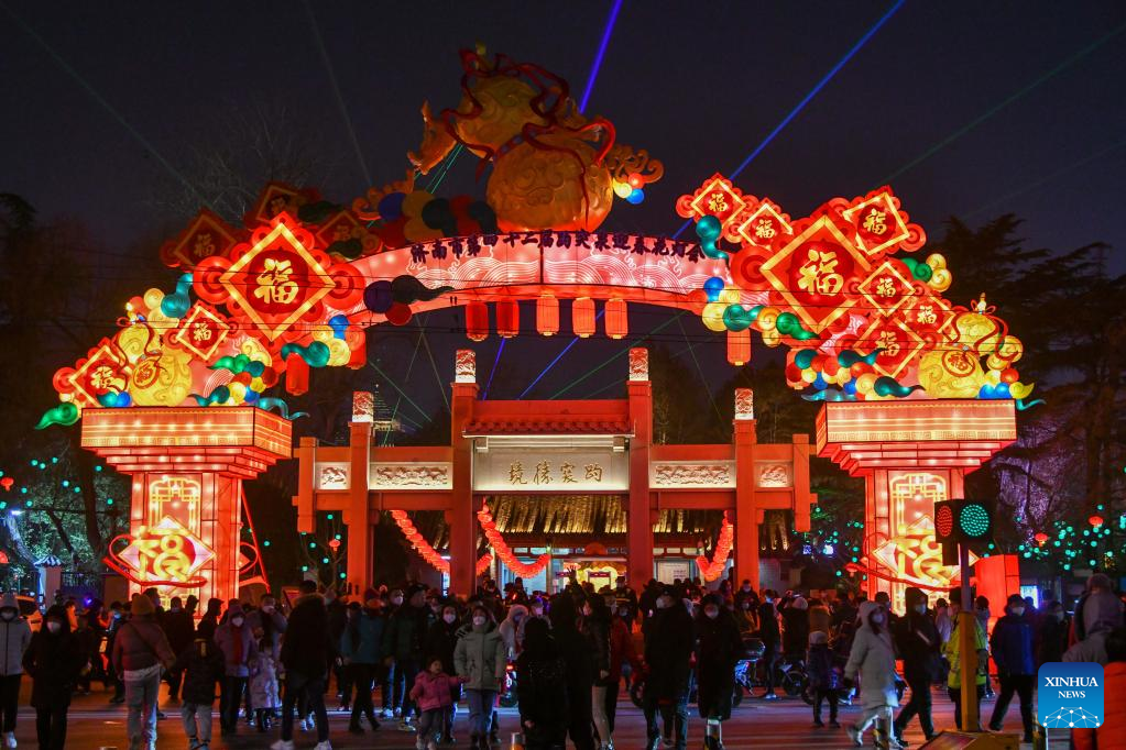 People enjoy lanterns set to celebrate the Spring Festival at the Baotu Spring in Jinan, east China's Shandong Province, Jan. 22, 2023. The Chinese Lunar New Year, or Spring Festival, falls on Sunday. (Xinhua/Zhu Zheng)