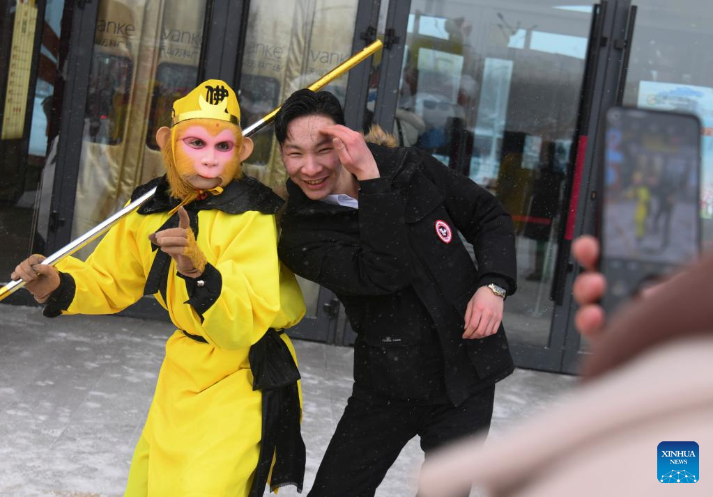 A resident poses for photos with a Shehuo performer at a plaza in Urumqi, northwest China's Xinjiang Uygur Autonomous Region, Jan. 22, 2023. The Shehuo parade is a time-honored performance enjoying widespread popularity in rural areas across China. It originated from ancient sacrificial activities to pray for a good harvest about 2,000 years ago. The Chinese Lunar New Year, or Spring Festival, falls on Sunday. (Xinhua/Wang Fei)