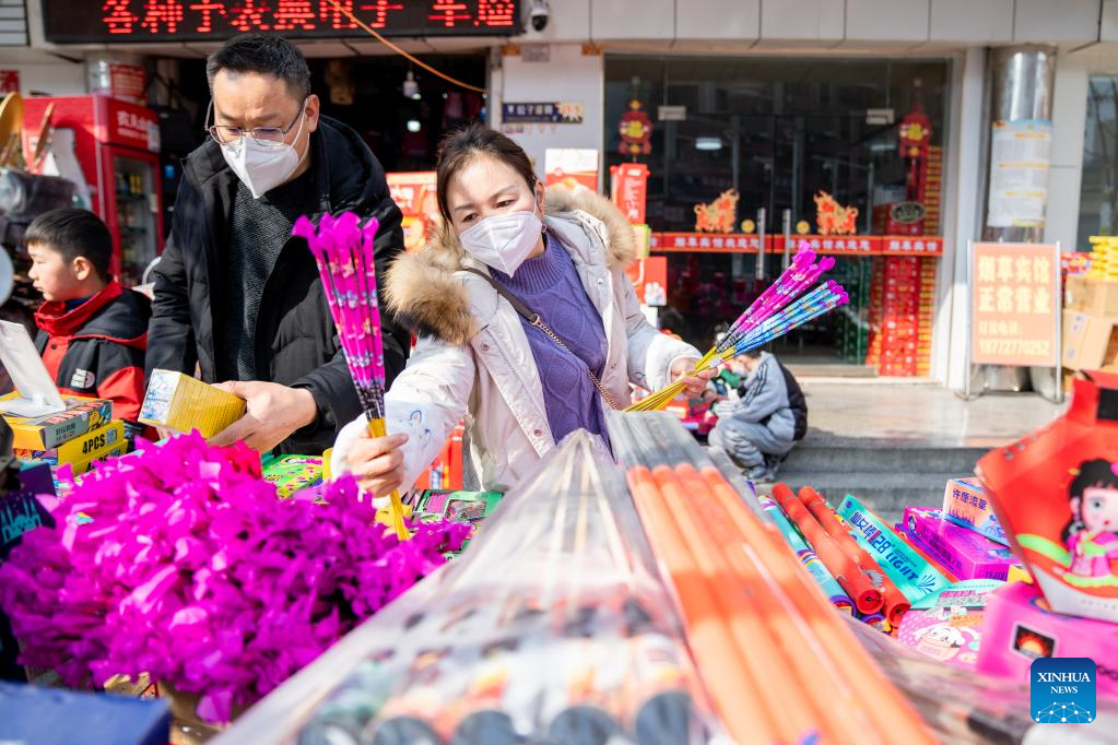 People buy sparklers and firecrackers in Zhushan County of central China's Hubei Province, Jan. 22, 2023. The Chinese Lunar New Year, or Spring Festival, falls on Sunday. (Xinhua/Wu Zhizun)