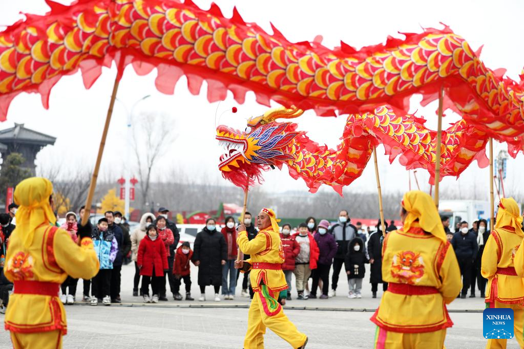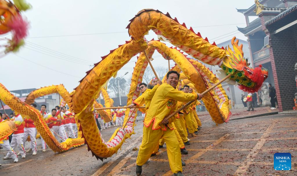 People perform dragon dance to celebrate the Spring Festival in Tancheng County of Linyi, east China's Shandong Province, Jan. 22, 2023. The Chinese Lunar New Year, or Spring Festival, falls on Sunday. (Photo by Zhang Chunlei/Xinhua)