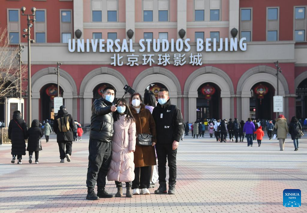 Tourists pose for photos at the Universal Beijing Resort in Beijing, capital of China, Jan. 22, 2023. The Chinese Lunar New Year, or Spring Festival, falls on Sunday. (Xinhua/Ren Chao)