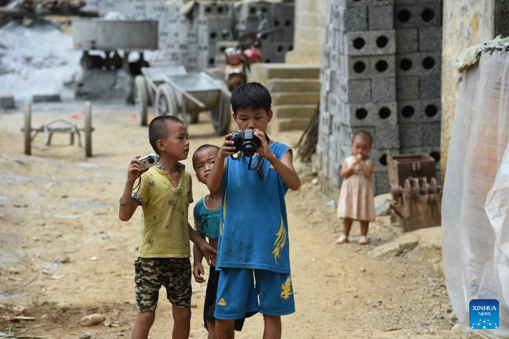 Meng Xuantai (R, front) learns photography during the summer vacation in Nongding Village of Bansheng Town, Dahua Yao Autonomous County, south China's Guangxi Zhuang Autonomous Region, Aug. 7, 2016.