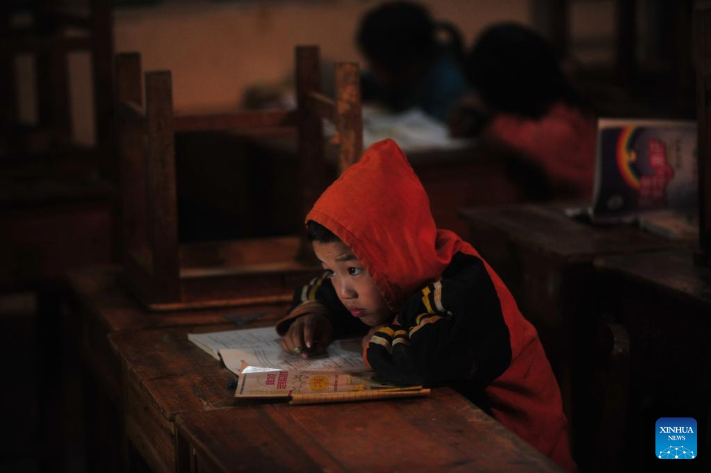 Meng Xuantai studies in a classroom at Nongyong primary school in Bansheng Town of Dahua Yao Autonomous County, south China's Guangxi Zhuang Autonomous Region, Dec. 26, 2012.