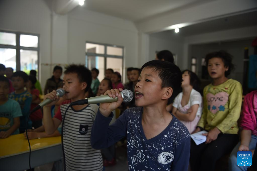 Meng Xuantai (R, front) attends a singing rehearsal at a vocal music classroom of Nongyong primary school in Bansheng Town of Dahua Yao Autonomous County, south China's Guangxi Zhuang Autonomous Region, May 26, 2016.
