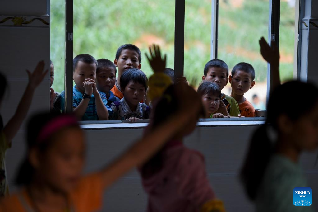 Meng Xuantai (2nd R) watches a rehearsal of their schoolmates outside a vocal music classroom of Nongyong primary school in Bansheng Town of Dahua Yao Autonomous County, south China's Guangxi Zhuang Autonomous Region, May 14, 2015.