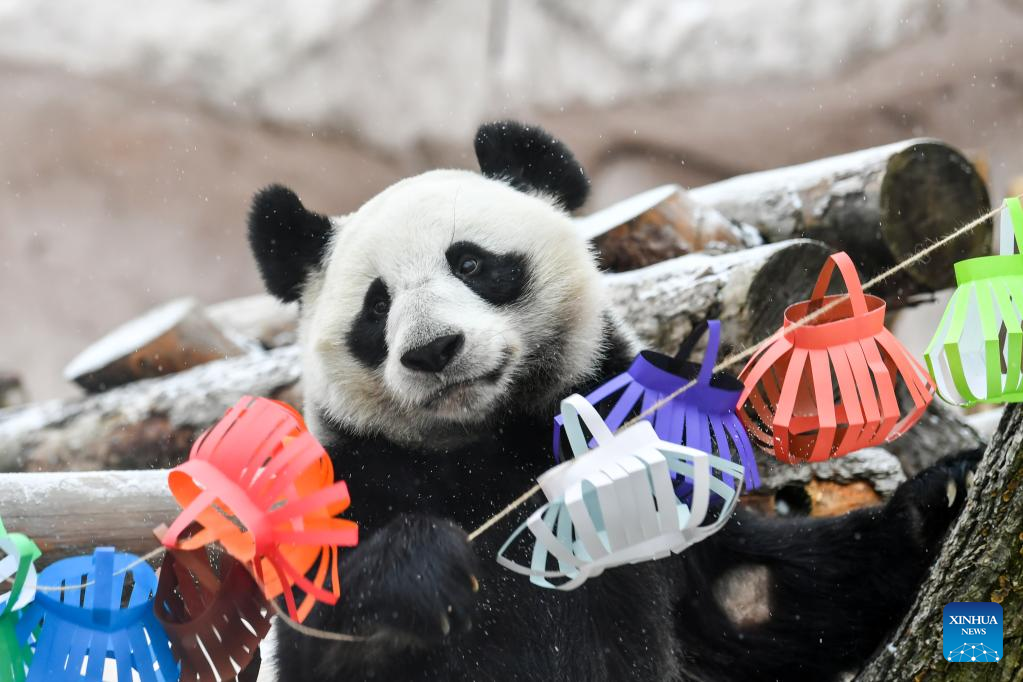 Giant panda Dingding plays with festive decorations at the Moscow Zoo in Moscow, capital of Russia, Jan. 23, 2023. The Moscow Zoo prepared food and festive decorations for giant pandas to celebrate the Chinese Lunar New Year. (Xinhua/Cao Yang)