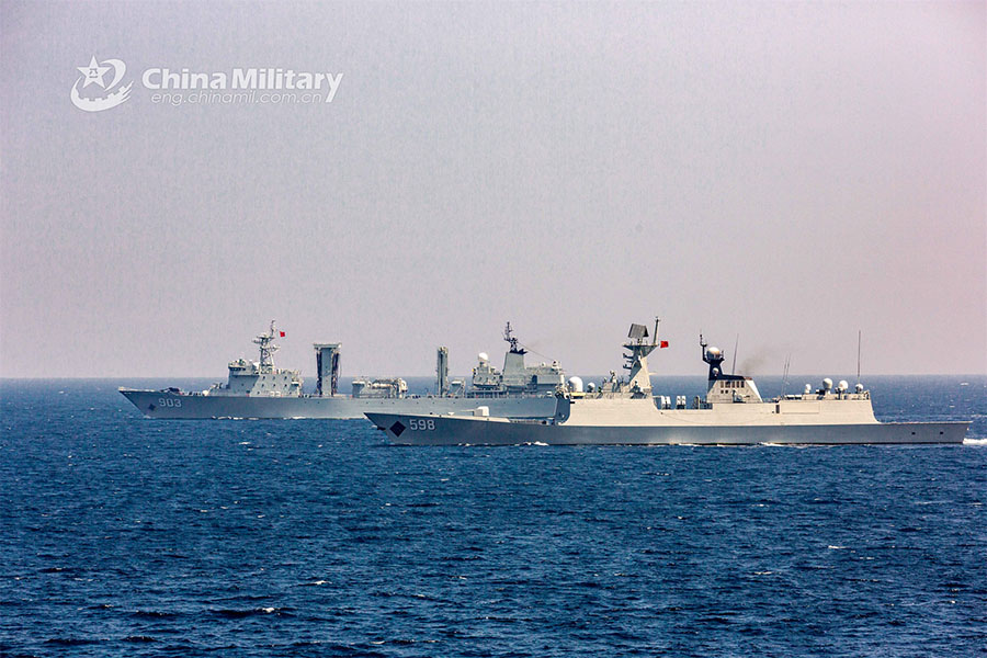 Vessels attached to the 42nd Chinese naval escort taskforce steam in formation in the waters of the Gulf of Aden during a maneuvering exercise in early January 2023. The exercise aimed to hone the taskforce’s capabilities of commanding and maneuvering vessels. (eng.chinamil.com.cn/Photo by Wang Qing)