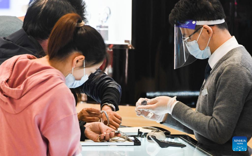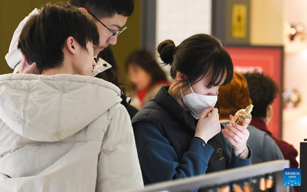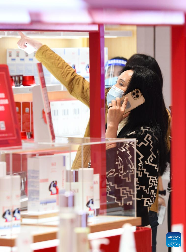 People shop at Haikou Riyue Plaza Duty Free Shop in Haikou, south China's Hainan Province, Jan. 25, 2023. Tourists went shopping in Hainan, a major tourist destination for visitors in winter, during the Spring Festival holiday. (Xinhua/Yang Guanyu)
