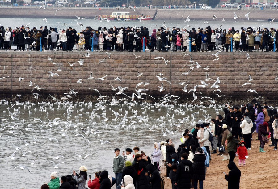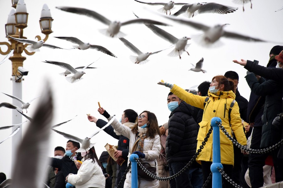 People Watch seagulls during Spring Festival holiday in E China's Shandong