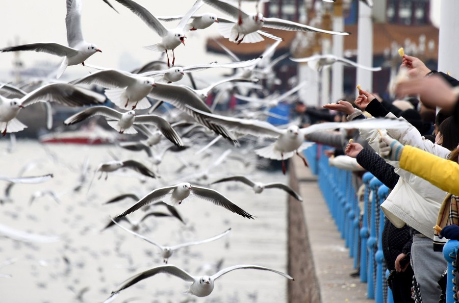 Visitors interact with seagulls at the Zhanqiao bridge scenic spot in Qingdao, east China's Shandong Province, Jan. 26, 2023. (Xinhua/Li Ziheng)