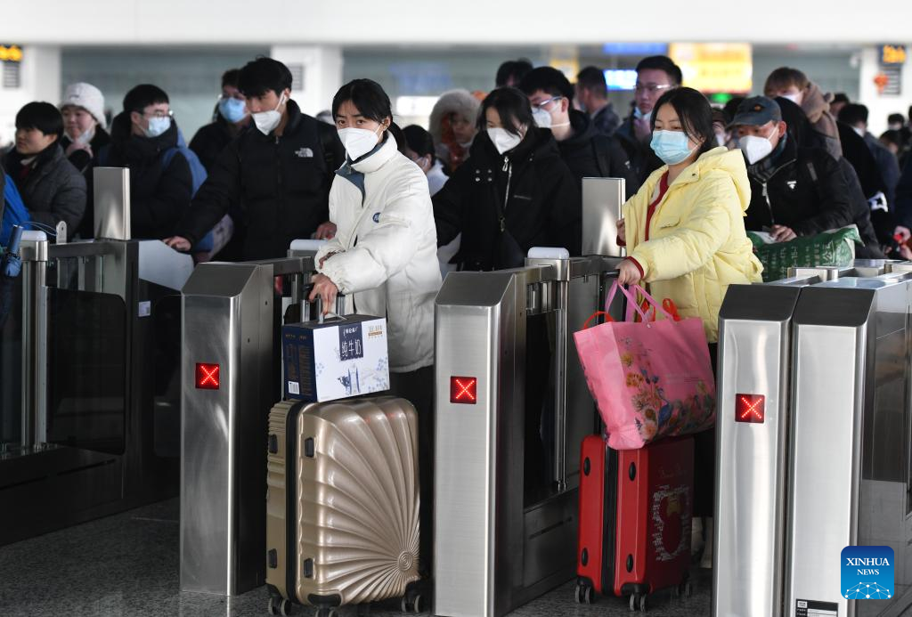 Passengers go through ticket barriers at Fuyang West Railway Station in east China's Anhui Province, Jan. 27, 2023. Railway stations, highways and airports across China are bracing for a fresh travel peak as a growing number of travelers hit the road and return to work after a week-long Spring Festival holiday which ends on Friday. (Photo by Lu Qijian/Xinhua)