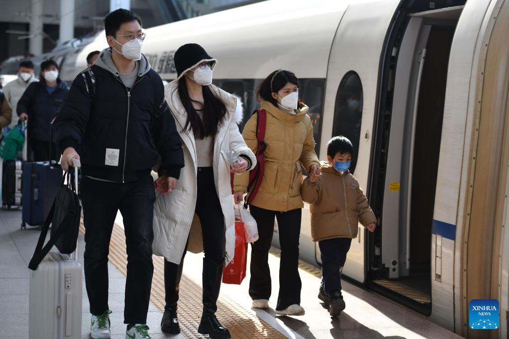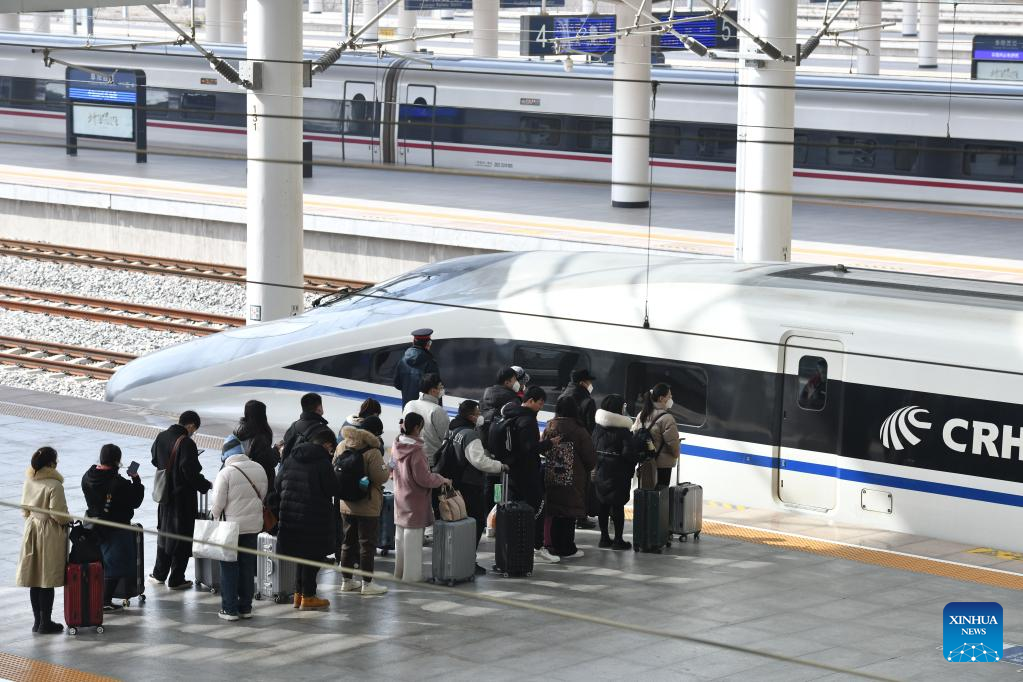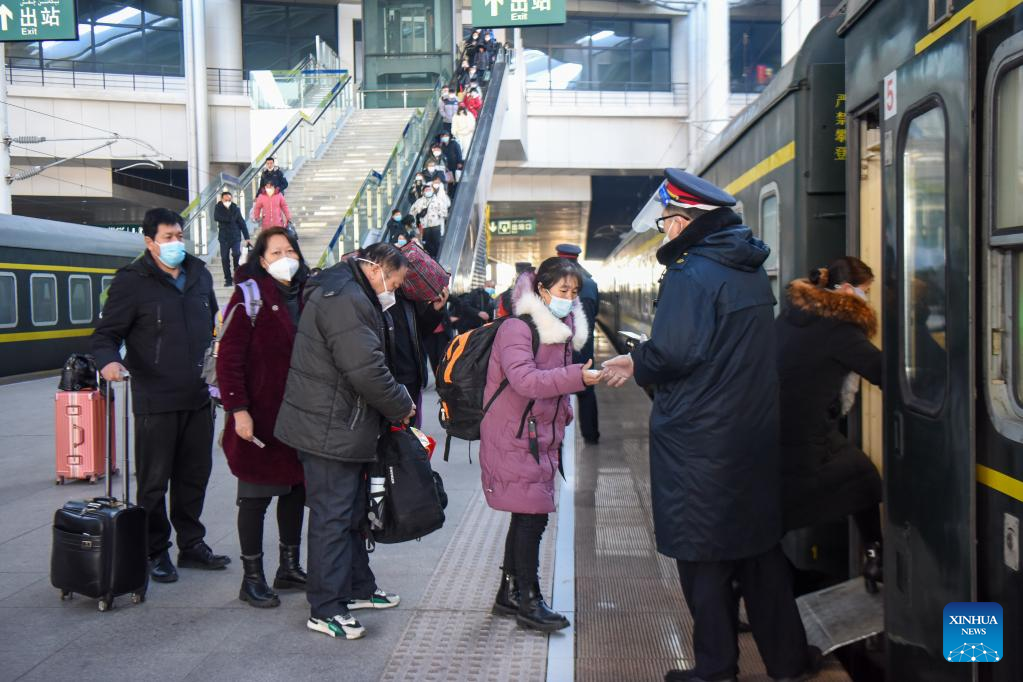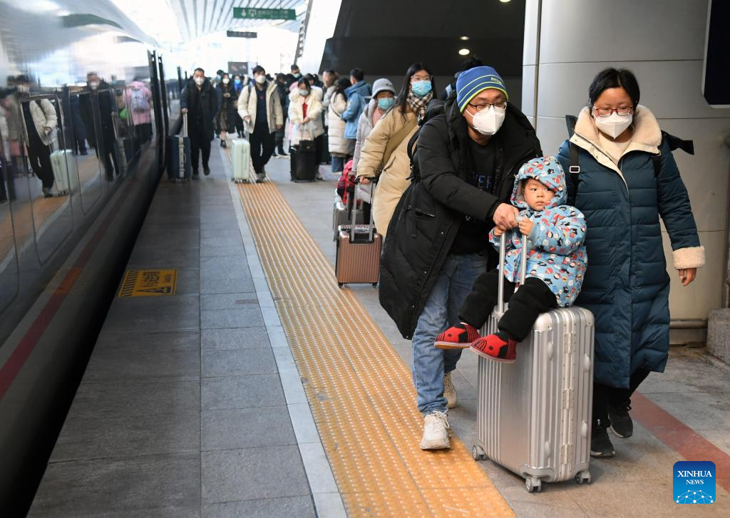 Passengers are going to borad a train at Fuyang West Railway Station in east China's Anhui Province, Jan. 27, 2023. (Photo by Lu Qijian/Xinhua)