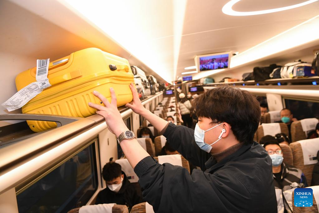 A passenger puts his luggage on the overhead shelf on a Train at Shapingba Railway Station in southwest China's Chongqing, Jan. 27, 2023. (Xinhua/Wang Quanchao)