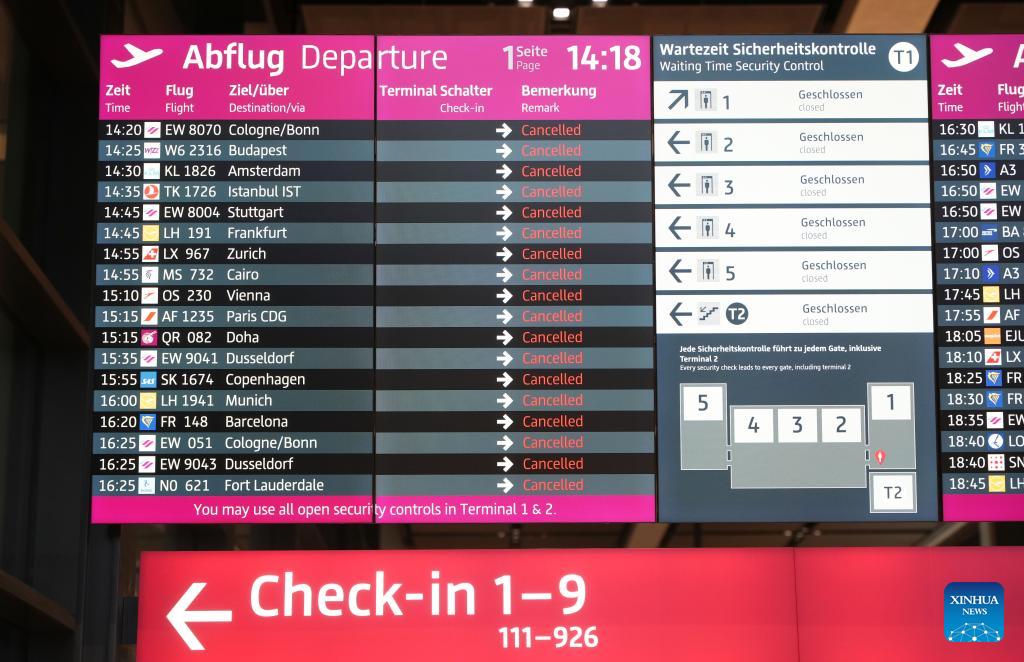 Information of cancelled flights is shown on a screen at a terminal of Berlin Brandenburg Airport in Schoenefeld, Germany, Jan. 25, 2023. All passenger flights at Berlin Brandenburg Airport were canceled or delayed on Wednesday due to a strike by airport workers, estimated to affect about 35,000 passengers. (Photo by Stefan Zeitz/Xinhua)