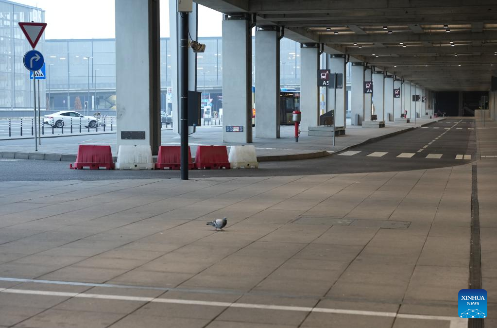 A pigeon is seen outside a terminal of Berlin Brandenburg Airport in Schoenefeld, Germany, Jan. 25, 2023. All passenger flights at Berlin Brandenburg Airport were canceled or delayed on Wednesday due to a strike by airport workers, estimated to affect about 35,000 passengers. (Photo by Stefan Zeitz/Xinhua)