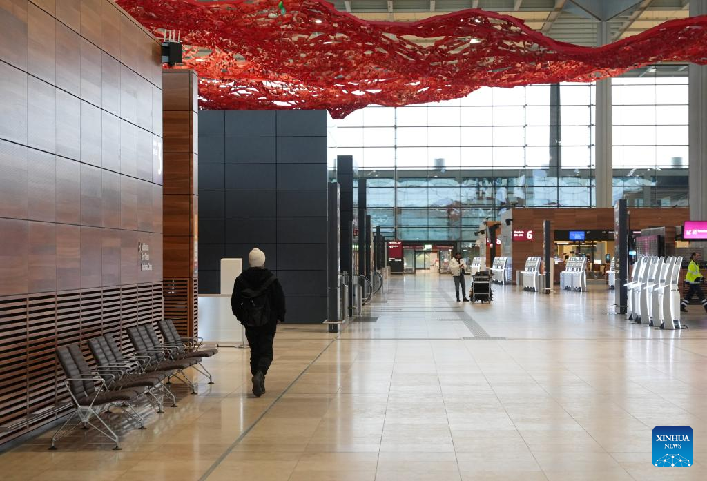 A woman walks in a terminal of Berlin Brandenburg Airport in Schoenefeld, Germany, Jan. 25, 2023. All passenger flights at Berlin Brandenburg Airport were canceled or delayed on Wednesday due to a strike by airport workers, estimated to affect about 35,000 passengers. (Photo by Stefan Zeitz/Xinhua)
