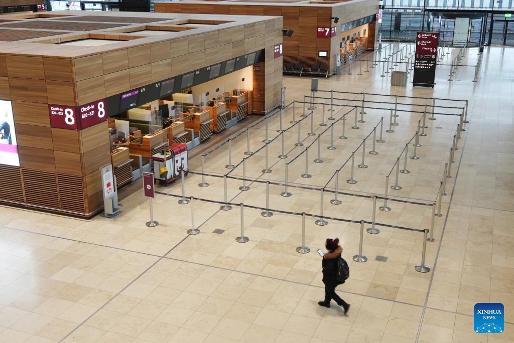 This photo taken on Jan. 25, 2023 shows the interior of a terminal of Berlin Brandenburg Airport in Schoenefeld, Germany. All passenger flights at Berlin Brandenburg Airport were canceled or delayed on Wednesday due to a strike by airport workers, estimated to affect about 35,000 passengers. (Photo by Stefan Zeitz/Xinhua)