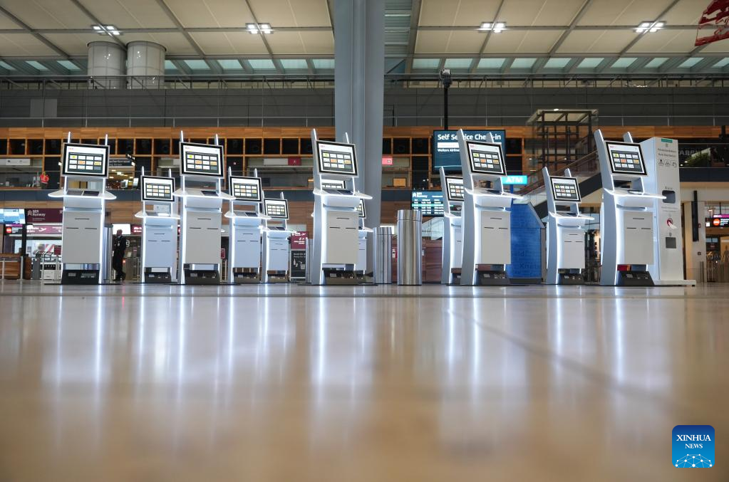 Self-service check-in machines are placed at a terminal of Berlin Brandenburg Airport in Schoenefeld, Germany, Jan. 25, 2023. All passenger flights at Berlin Brandenburg Airport were canceled or delayed on Wednesday due to a strike by airport workers, estimated to affect about 35,000 passengers. (Photo by Stefan Zeitz/Xinhua)