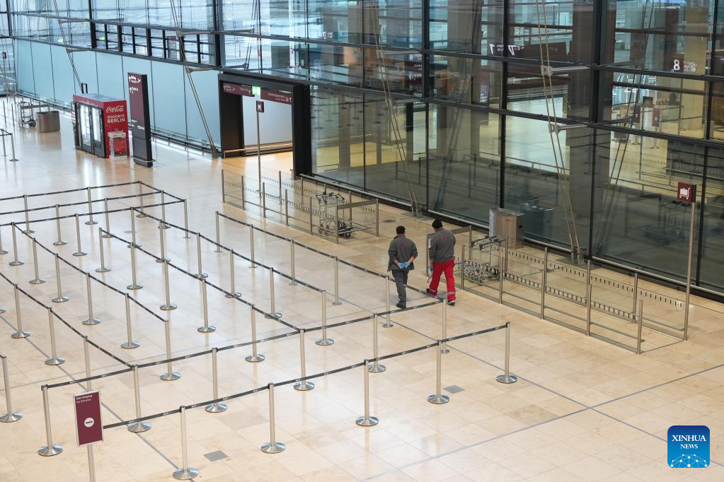 Staff members walk in a terminal of Berlin Brandenburg Airport in Schoenefeld, Germany, Jan. 25, 2023. All passenger flights at Berlin Brandenburg Airport were canceled or delayed on Wednesday due to a strike by airport workers, estimated to affect about 35,000 passengers. (Photo by Stefan Zeitz/Xinhua)