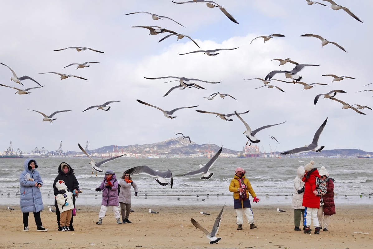 Tourists watch seagulls at a beach in Yantai, Shandong province on Jan 27, 2023. [Photo by Tang Ke/chinadaily.com.cn]