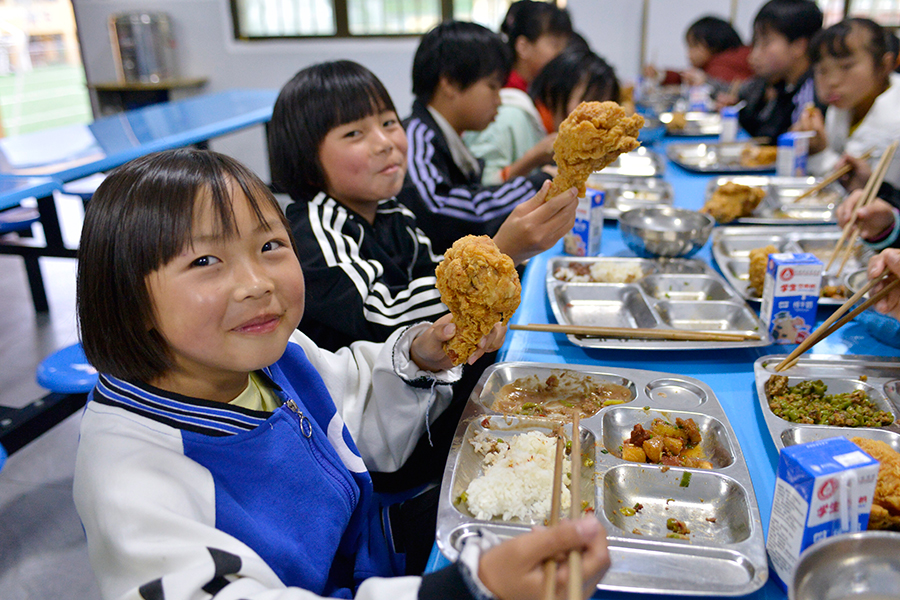 Students enjoy their meal at Yuanbao Primary School. [PHOTO/CHINA DAILY]