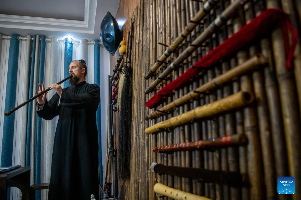 Jake Lee Pinnick plays the Xiao, a vertical end-blown flute which is generally made of bamboo, at his home in Danjiangkou, central China's Hubei Province, Jan. 12, 2023. (Xinhua/Wu Zhizun)