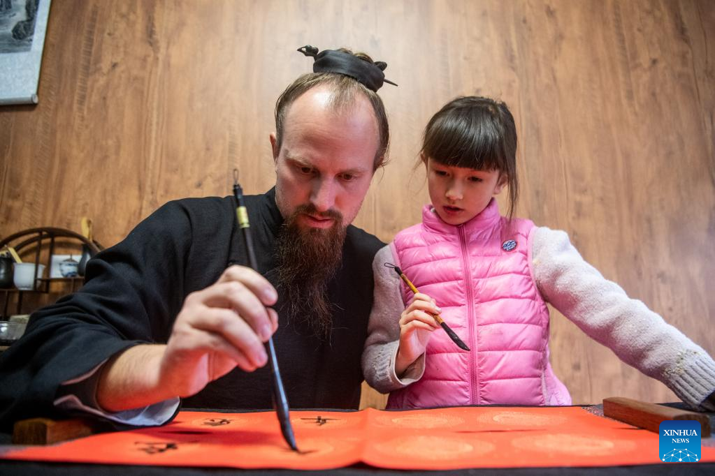 Jake Lee Pinnick writes Spring Festival couplets with his daughter at his home in Danjiangkou, central China's Hubei Province, Jan. 12, 2023. (Xinhua/Wu Zhizun)