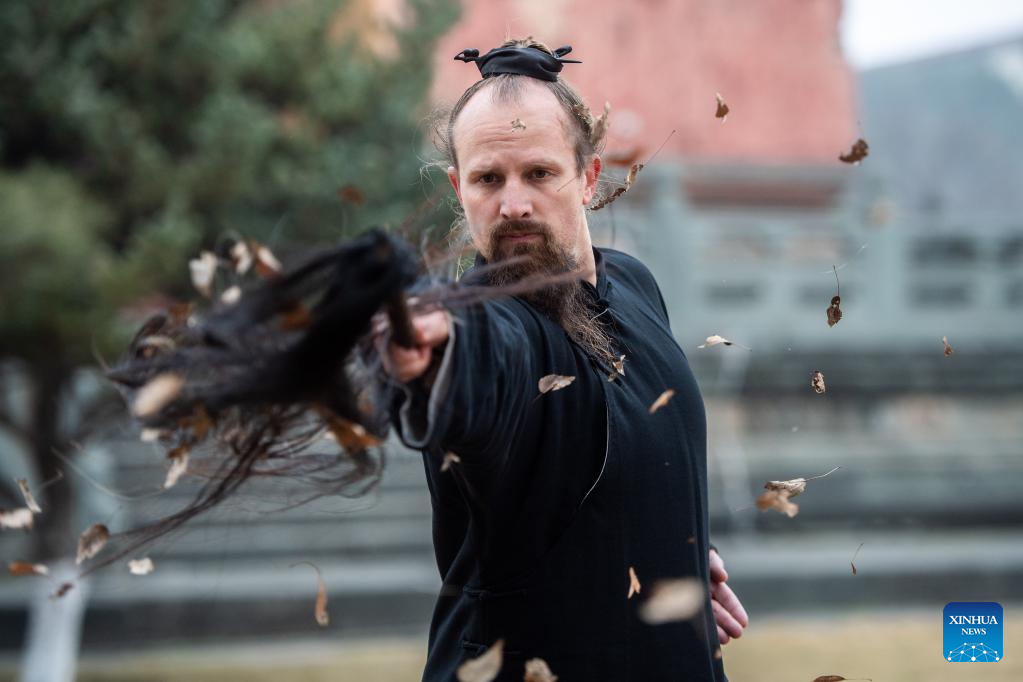 Jake Lee Pinnick practices martial arts at the Wudang Mountains in Danjiangkou, central China's Hubei Province, Jan. 11, 2023. (Xinhua/Wu Zhizun)