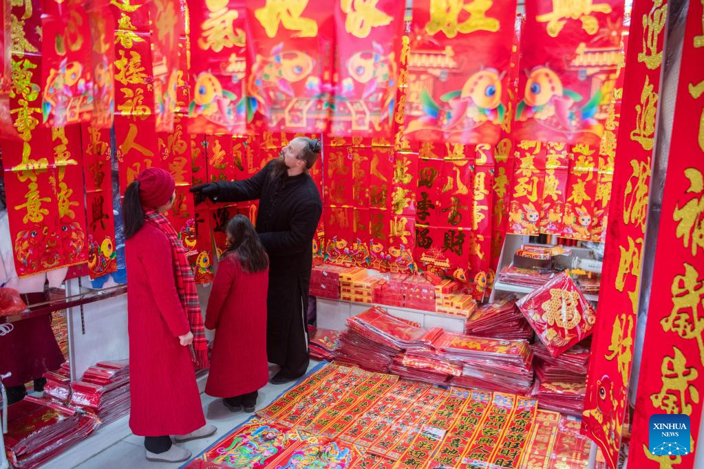 Jake Lee Pinnick and his family select Spring Festival couplets in Danjiangkou, central China's Hubei Province, Jan. 12, 2023. (Xinhua/Wu Zhizun)